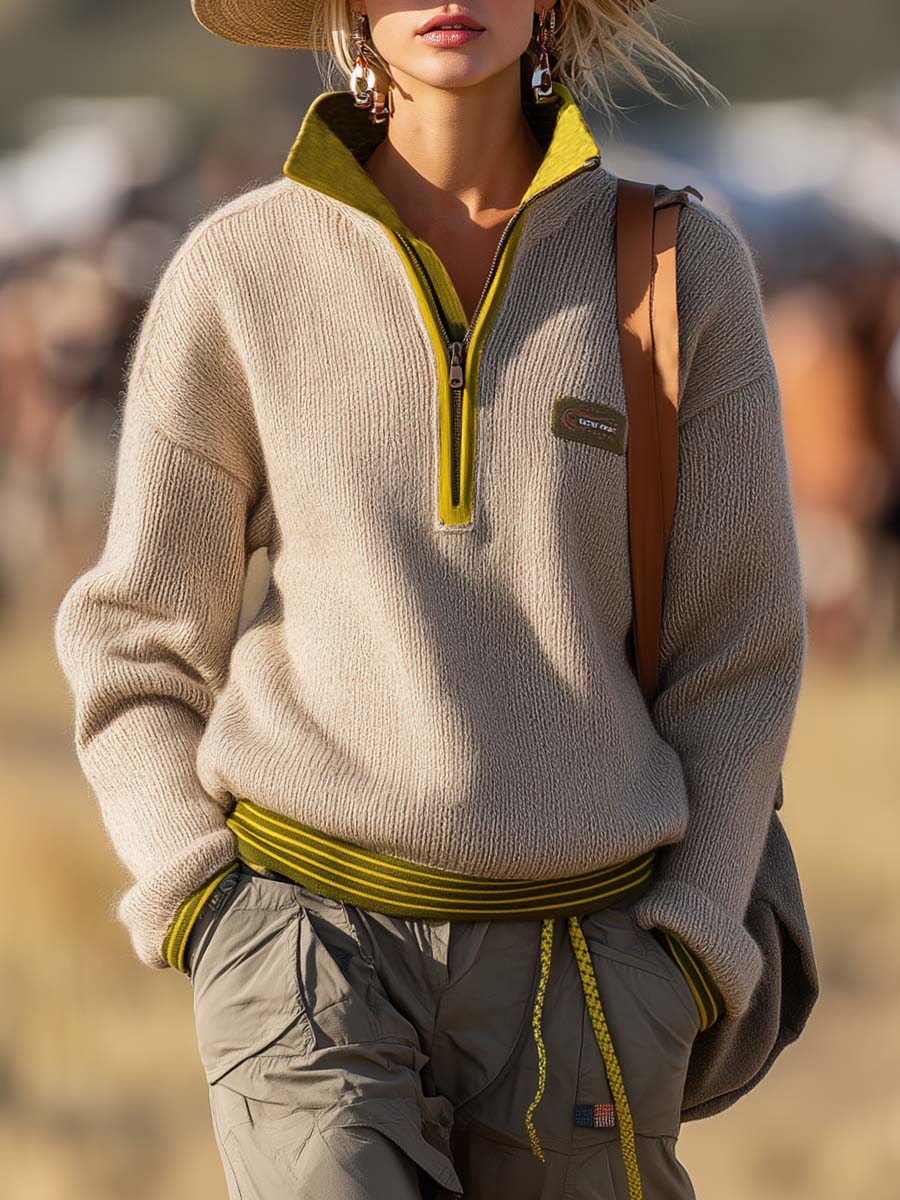Retro Fashion Sports Lapel Front Zipper Yellow Green Trim Beige Knitted Sweatshirt