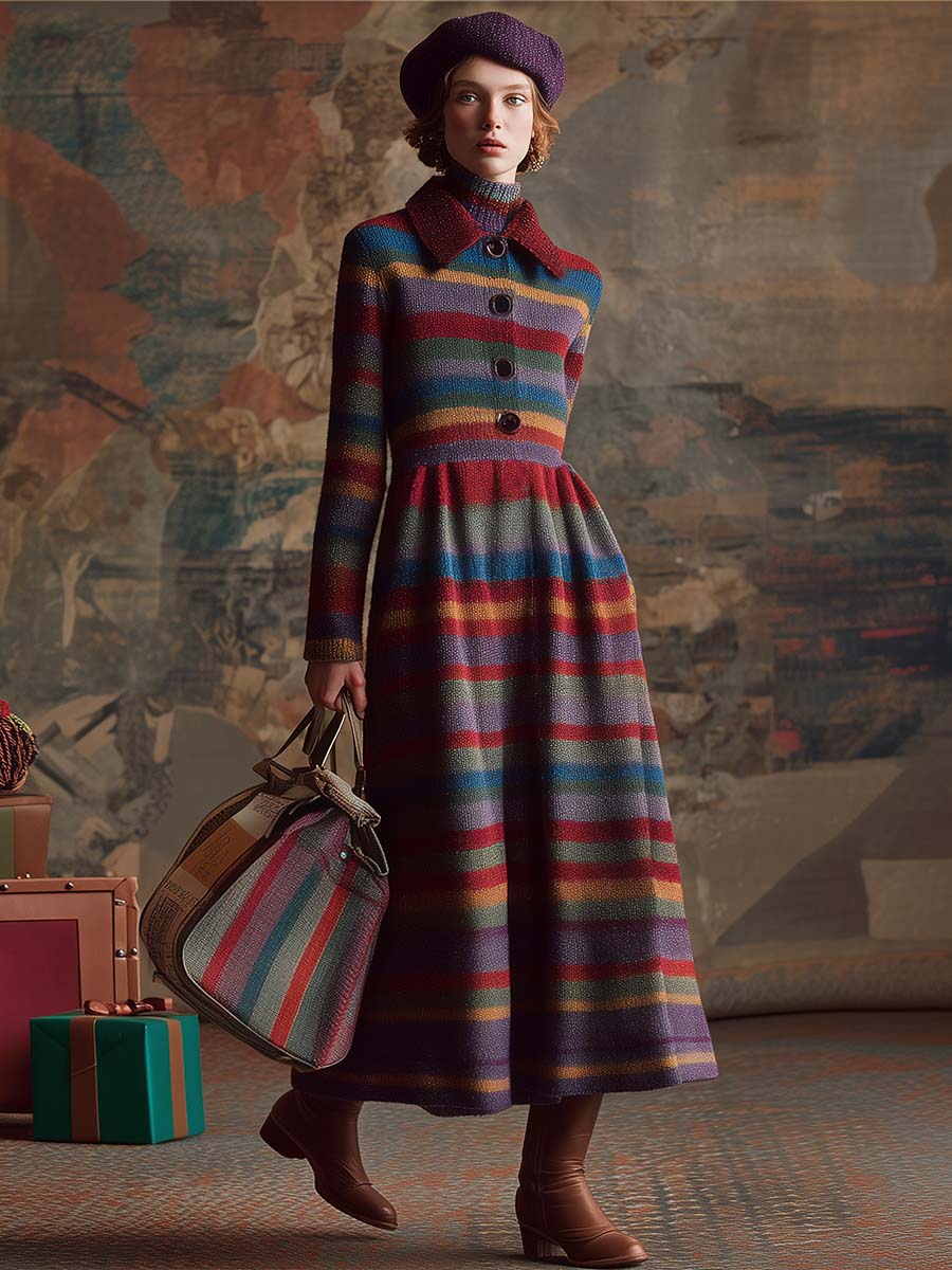 Retro Fashion Lapel Front Button Bubble Hem Multi-color Contrast Striped Knitted Midi Dress