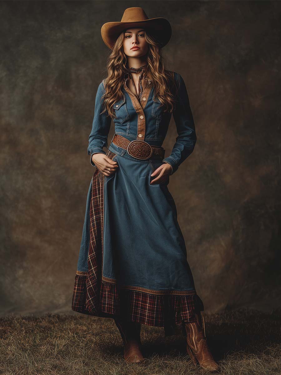 Retro Western Lapel Front Button Plaid Trim Blue Denim Midi Dress