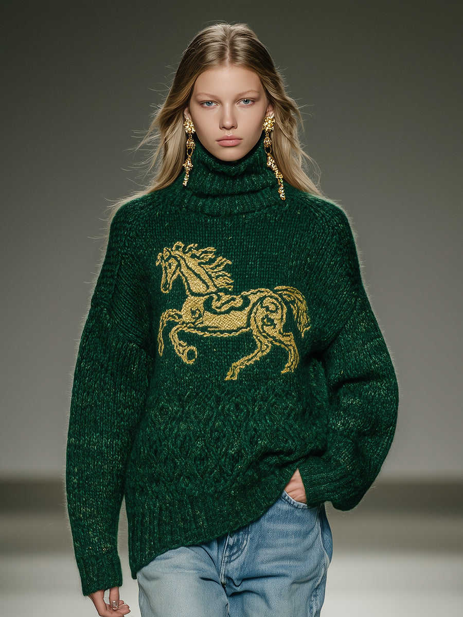 Fashionable Green Turtleneck With Horse Pattern On Chest Sweater