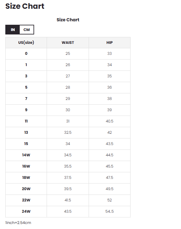34" Leg Opening (Size 5): 17" Leg Opening (Size 14W):