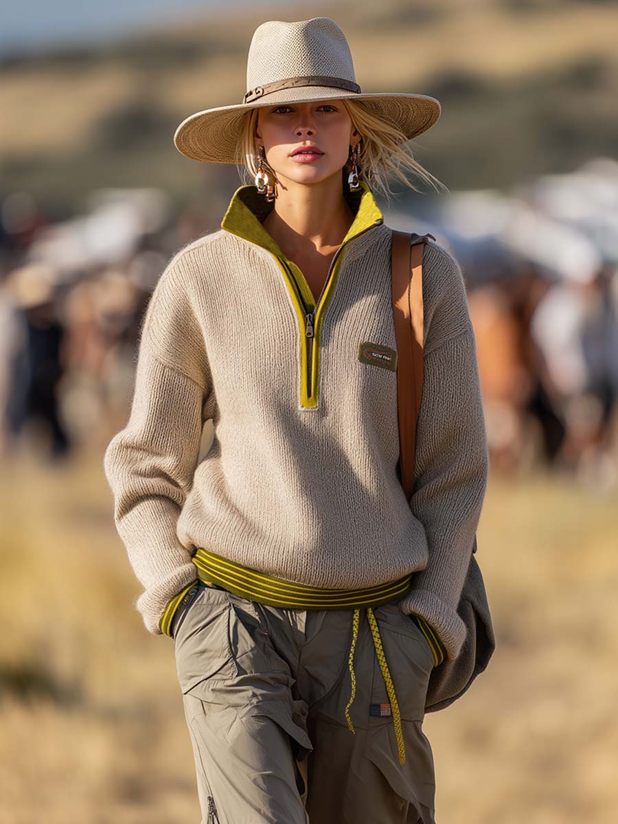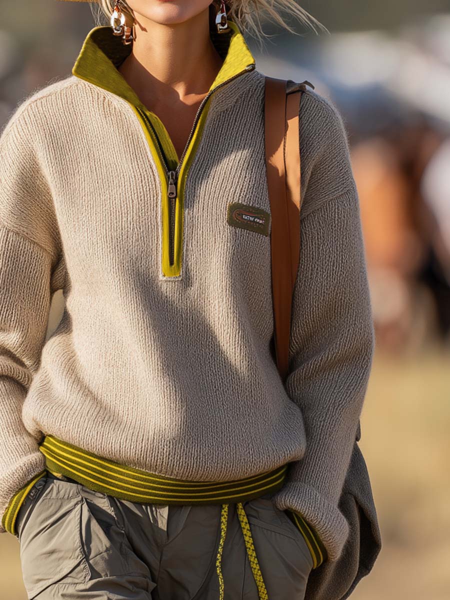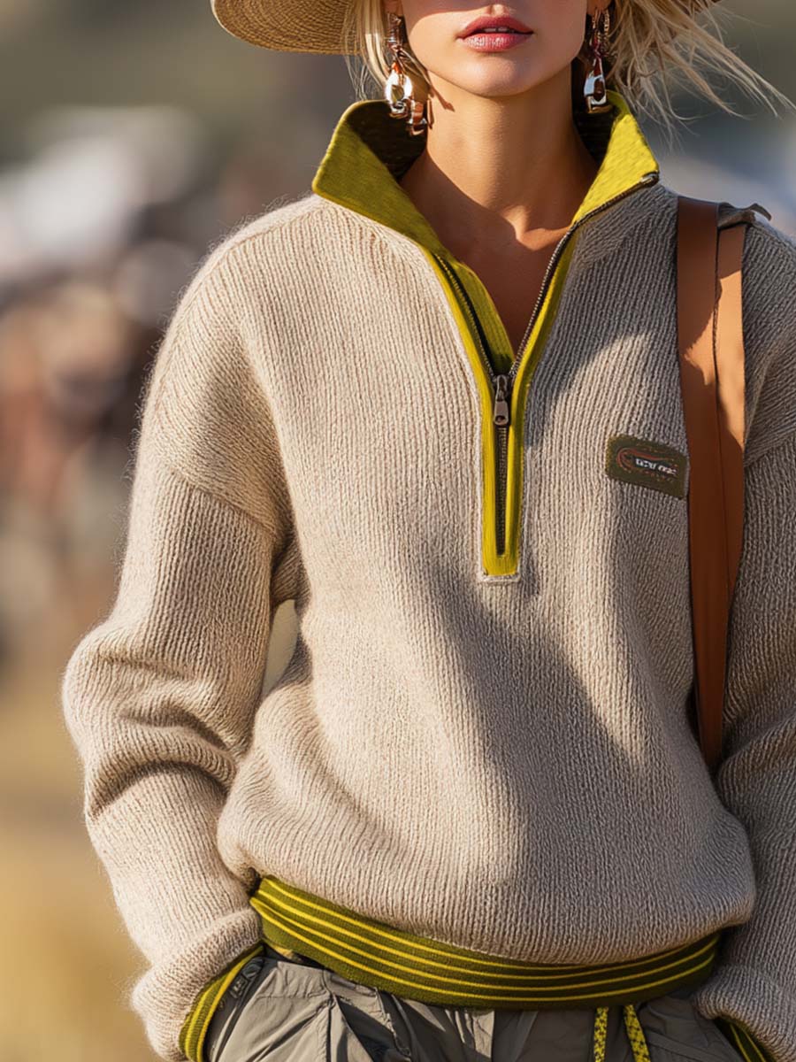 The Retro Fashion Sports Lapel Front Zipper Yellow Green Trim Beige Knitted Sweatshirt is a chic and versatile piece that blends modern style with a vintage sports vibe. Crafted with attention to detail, this sweatshirt features a charming lapel design and a functional front zipper that adds convenience and style.
