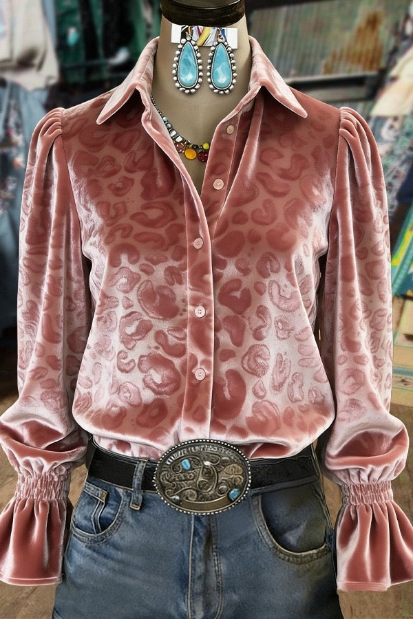 Retro Textuerd Leopard Bell Sleeves Velvet Shirt