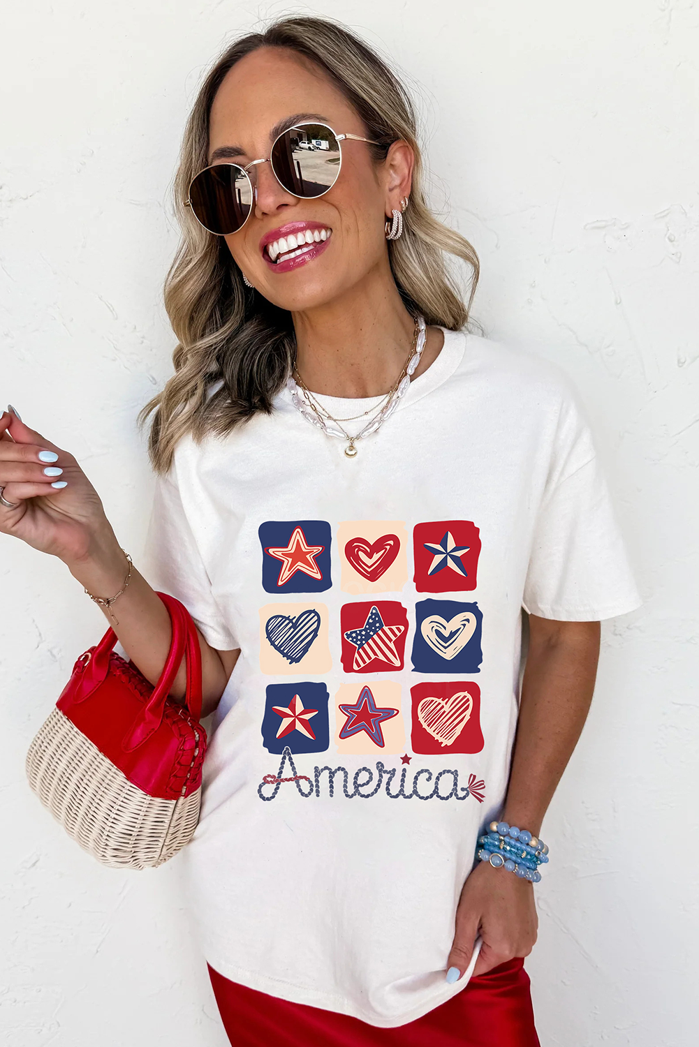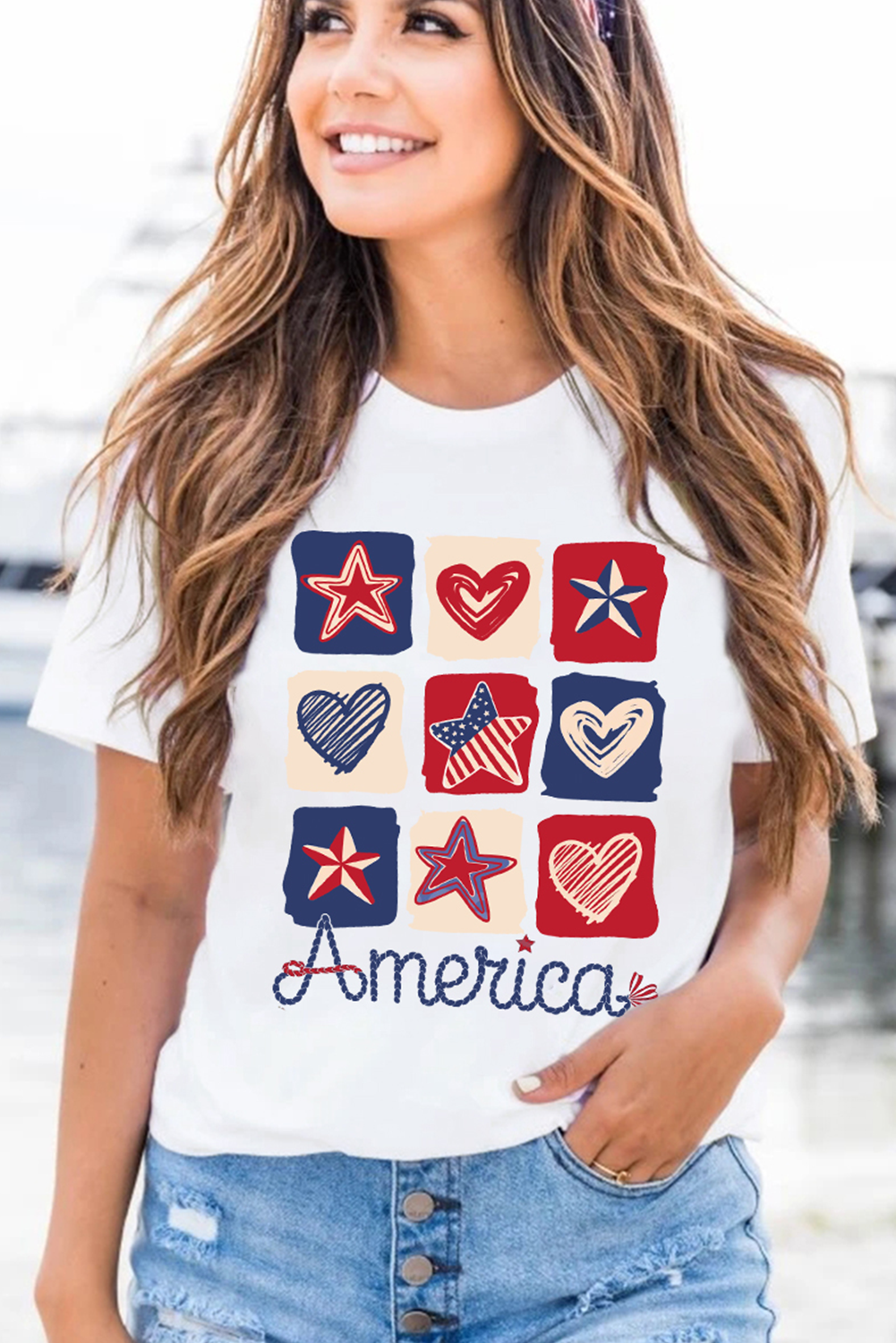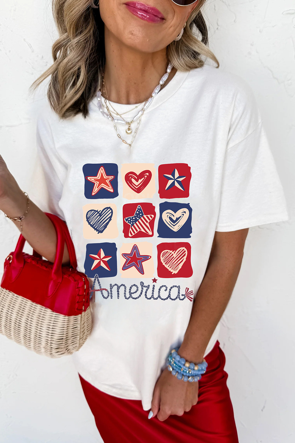 Features a checked pattern of hearts and stars with flag inspiration.
